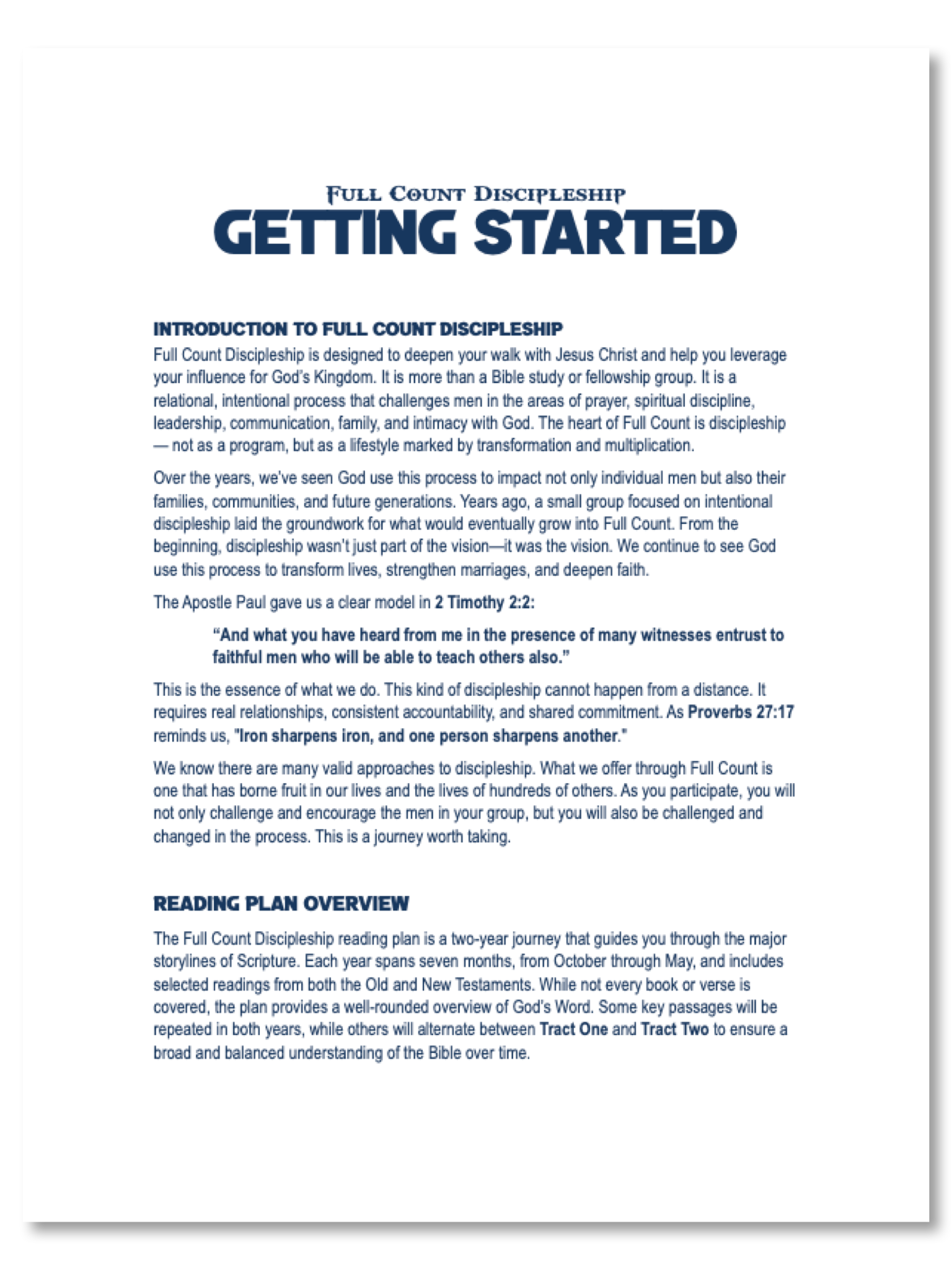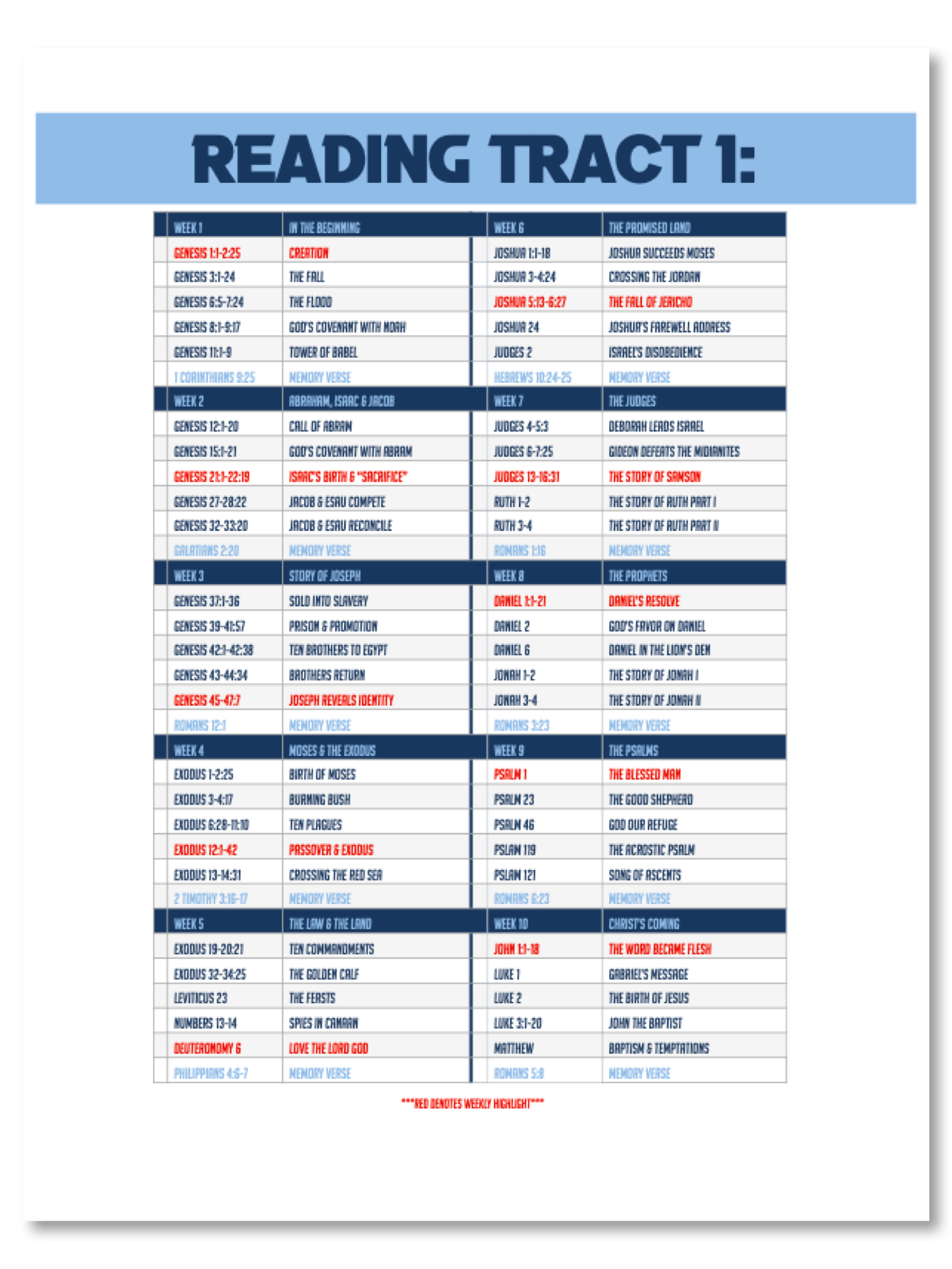 Reading Tracts are flexible to meet your group’s needs. Each week includes scripture memory and a “highlight” passage.